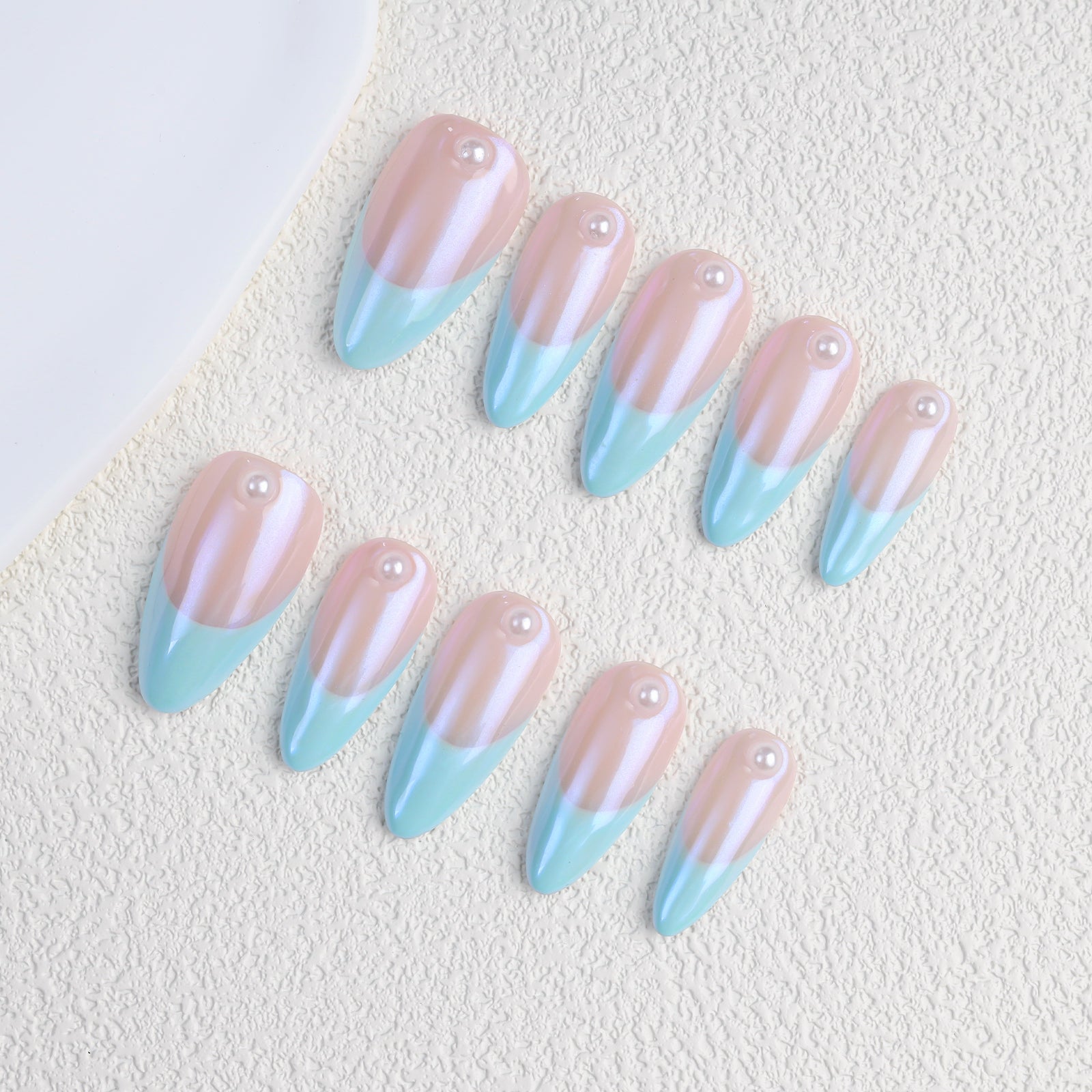 Blue Aurora Almond-Shaped French Style Artificial Nails Long Handmade High Quality Reusable Pearl for Finger Application