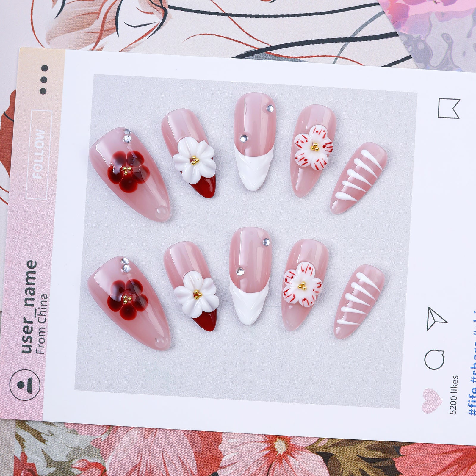 Handmade Almond Press-On Nails | 3D Red White Flower with Rhinestone & Stripe Design | Romantic Glue-On Nails