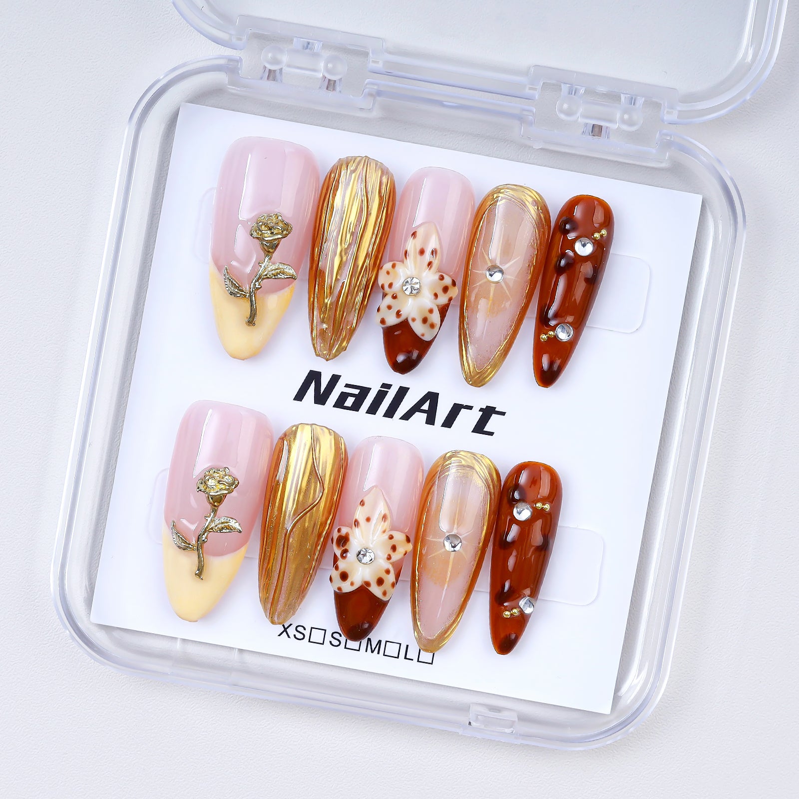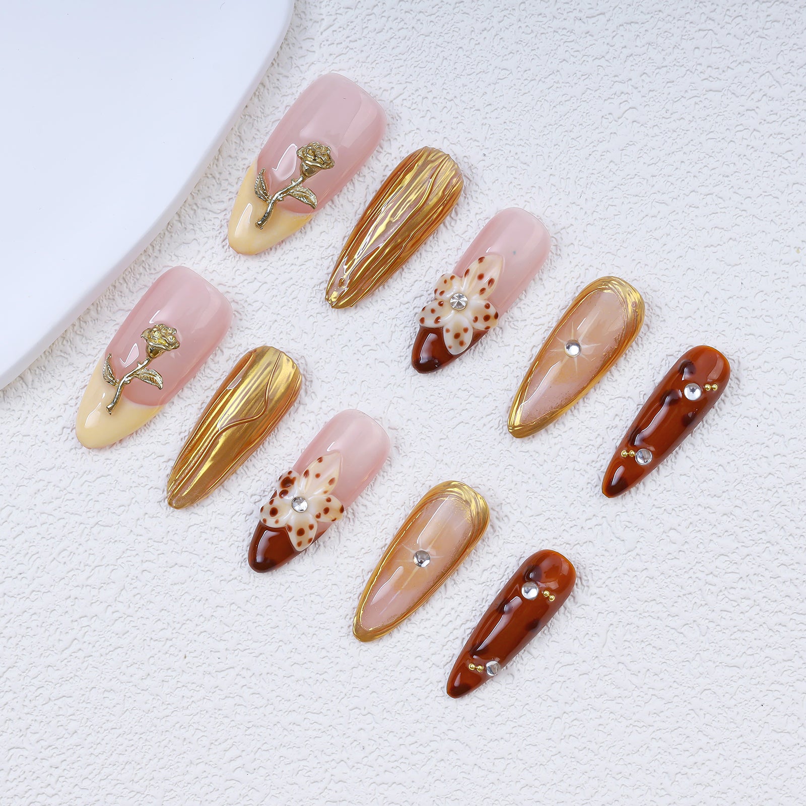 Handmade Almond Press-On Nails | Pink Gold Rose & Amber Tortoiseshell with Rhinestone | Luxury Glue-On Nails