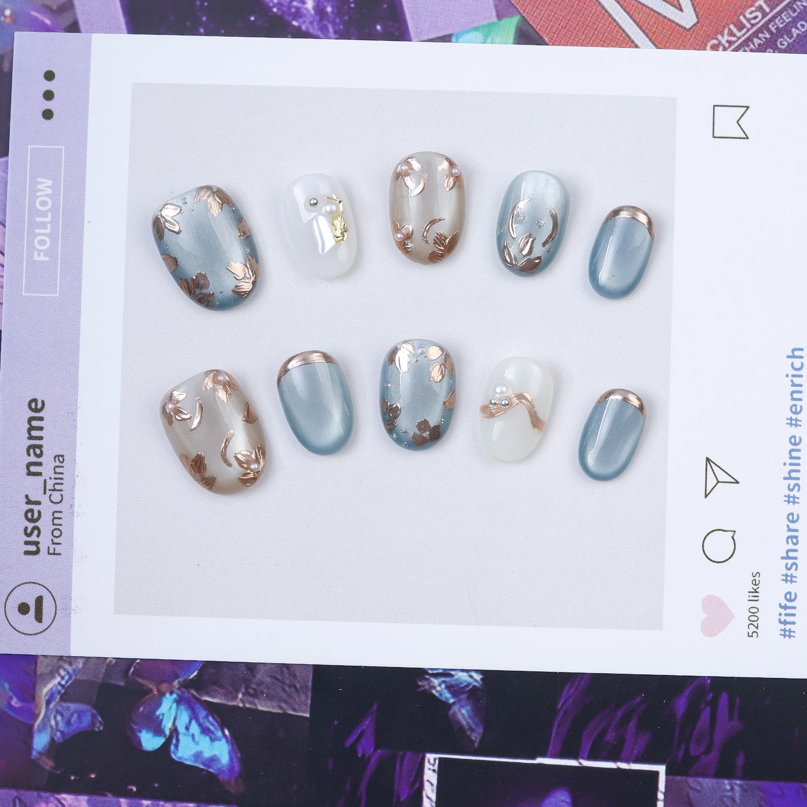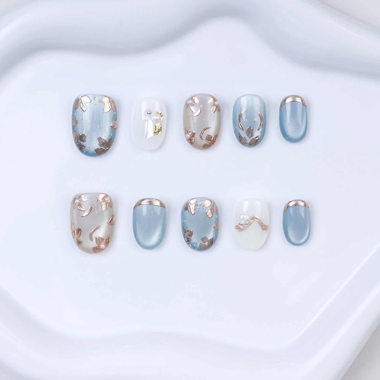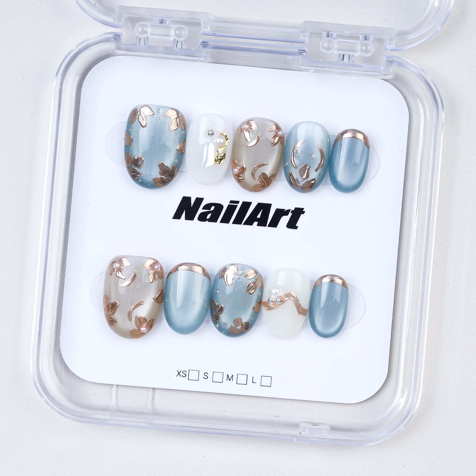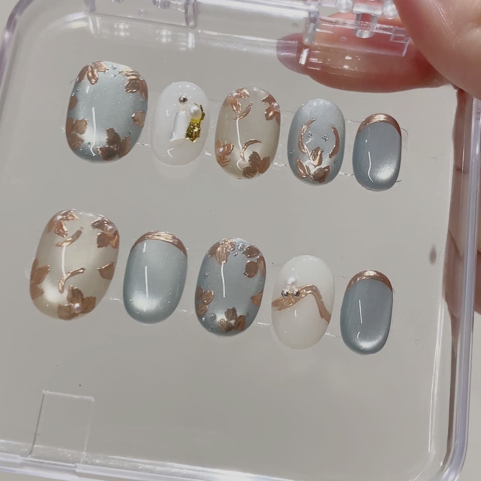 Handmade Squoval Press-On Nails | Shiny Platinum Cat Eye & Gold Leaf Design | Custom Glue-On Nails