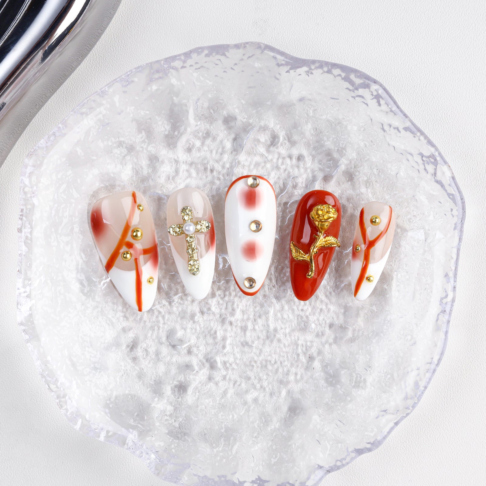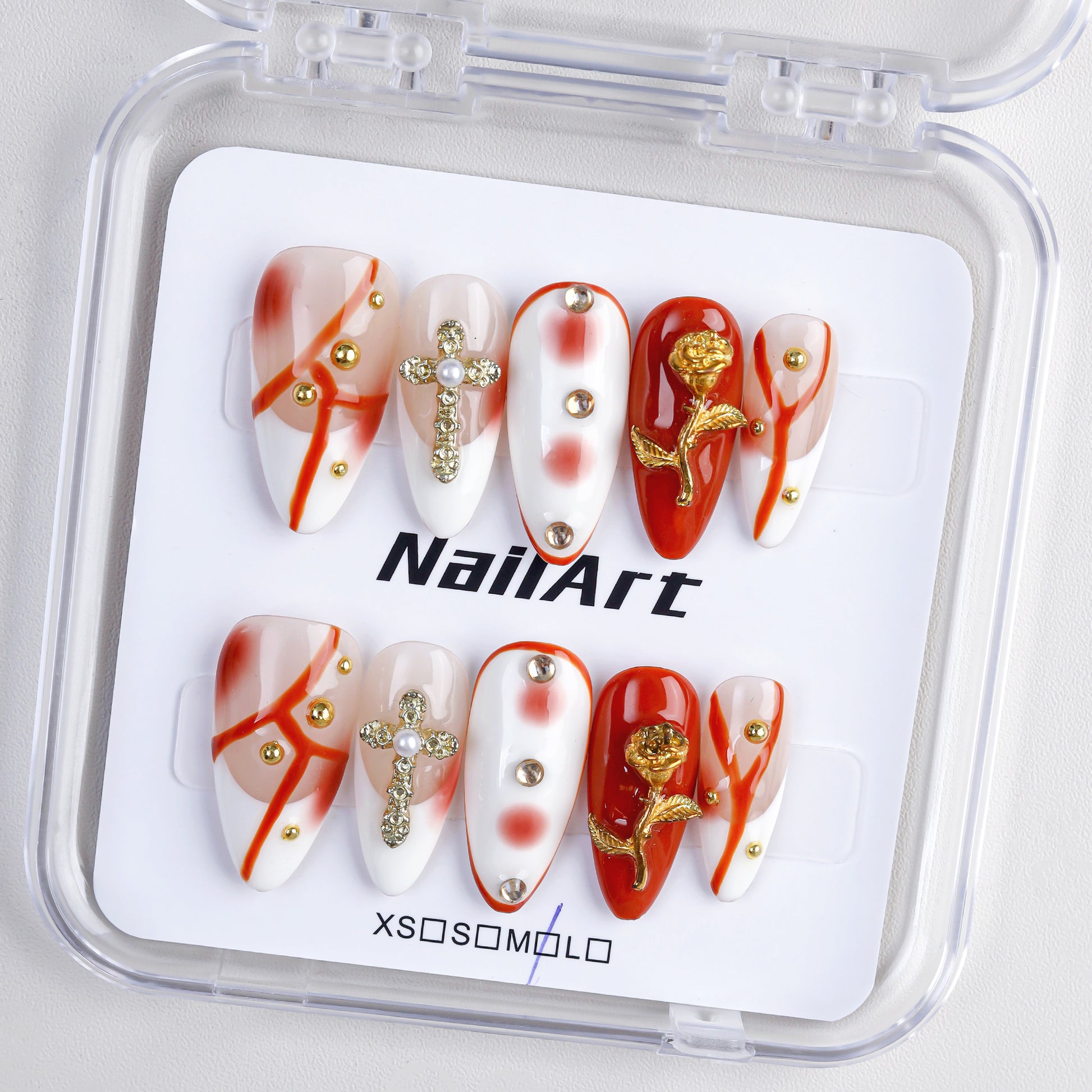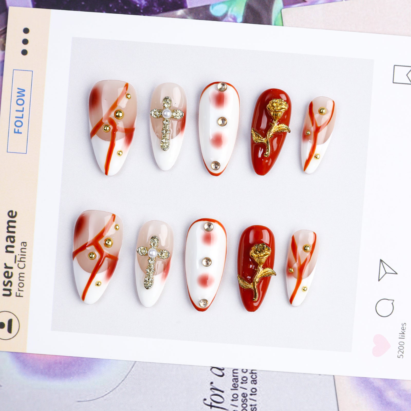 New Popular Hand Painted Cross Rose Almond False Nails 10pcs Artificial Press Nails for Girls Handmade Wholesale for Finger